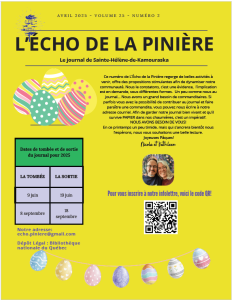 Ce journal existe grâce aux efforts investis par des bénévoles de Sainte-Hélène-de-Kamouraska. Ils s’occupent de tout de A à Z (appel de textes, publicité, correction, mise en page, etc.). Leur implication est précieuse et nous les en remercions chaleureusement!