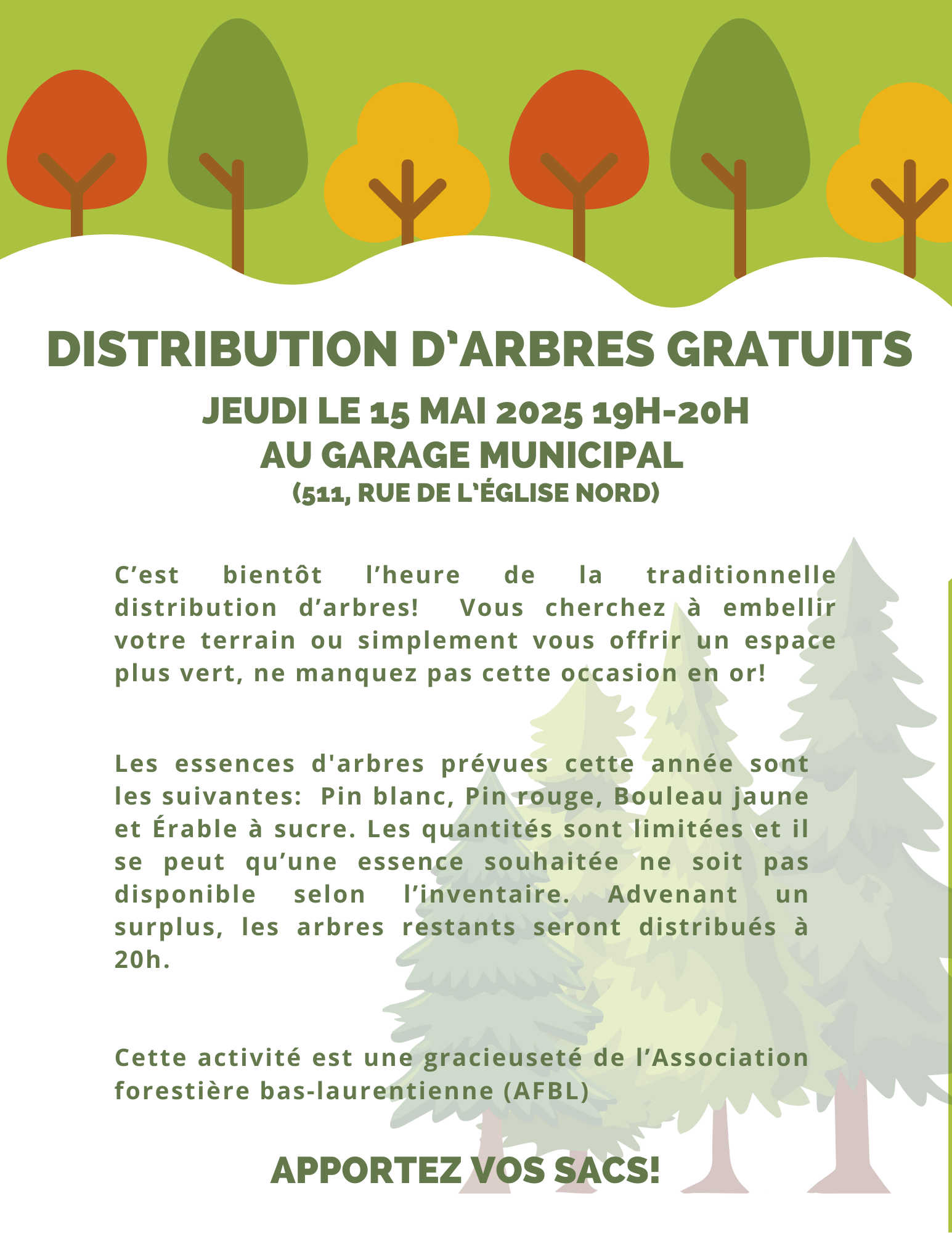 La municipalité offrira des arbres gratuitement à tous les Hélénois, jeudi le 15 mai au garage municipal. Tous les détails de ce bel événement annuel se trouvent dans cette image ⬇️