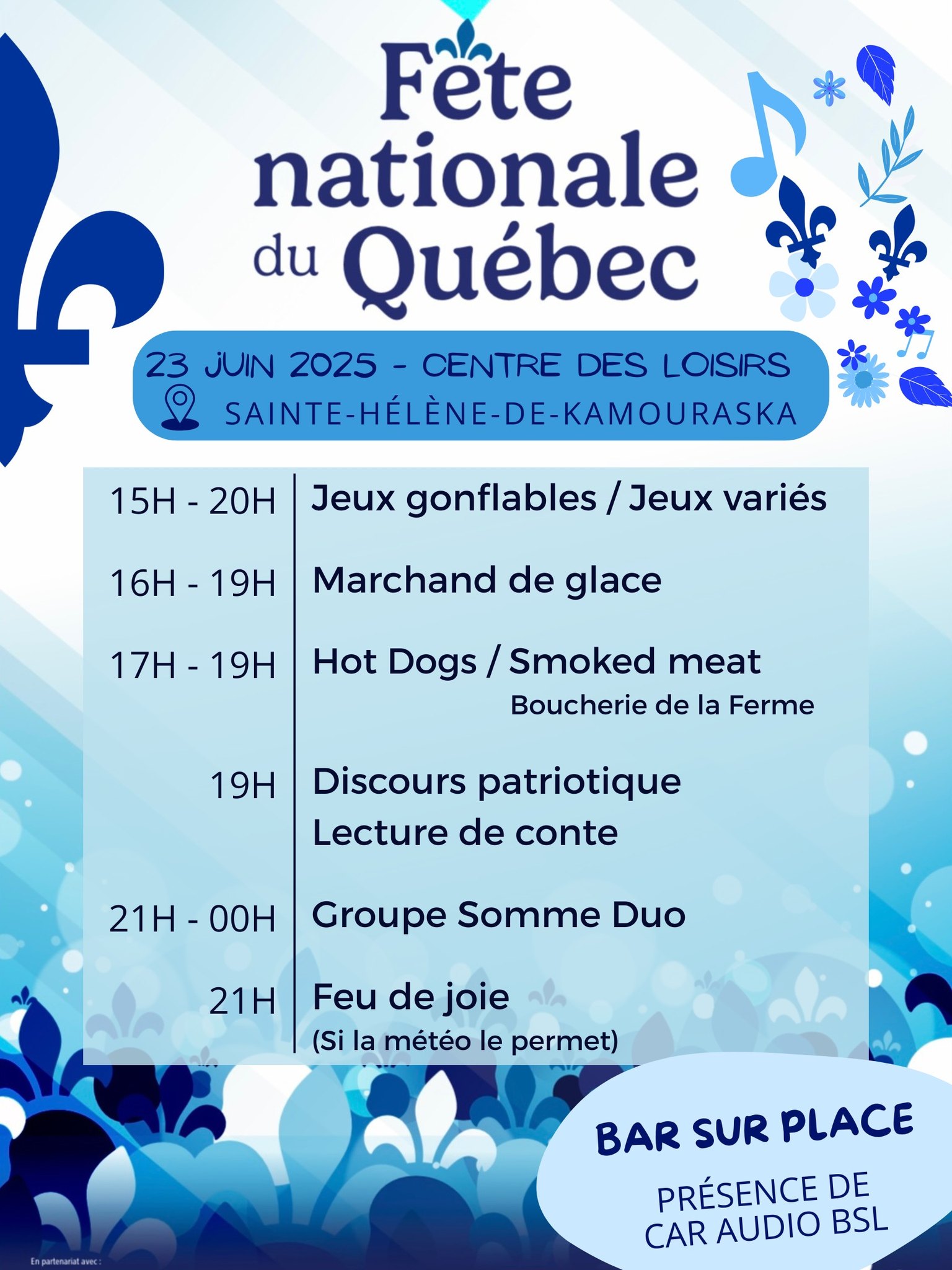 Soyez des nôtres pour festoyer le 23 juin 2025 dès 15h au parc Adélard-Lapointe/Centre des loisirs!