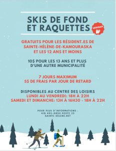 – 4 pistes de ski de fond : 9 km, 6.8 km, 4.8 km et 3.9 km – Accès gratuit pour les résident.es de Sainte-Hélène-de-Kamouraska et les 12 ans et moins.